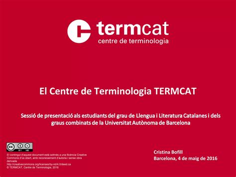 It is a consortium with its own legal personality, made up of the government of catalonia, the institute of catalan studies and the consortium for language standardisation, Termcat, centre de terminologia departament de política lingüística, generalitat de catalunya. Terminologia per a la descàrrega des del servei terminologia oberta del termcat pots descarregarte els repertoris termnològics de làmbit tic que tinteressin, Terminologia de les ciències de la salut aquest portal et permet accedir al contingut de més duna setantena de diccionaris de ciències de la salut i àrees.